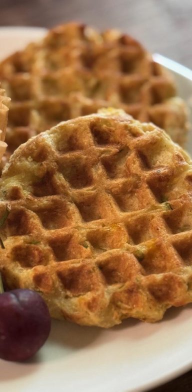 I love a waffle, and this recipe is no exception. My favorite way to enjoy these is make them, let them come to room temp, and then store in the fridge. When I’m ready for one, I put it in the air fryer to crisp it up. By essentially cooking it twice, you end up with a very crispy outer layer with bits of caramelization from the sugars in the corn. They’re delightful!
